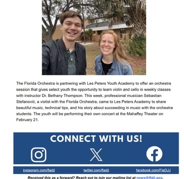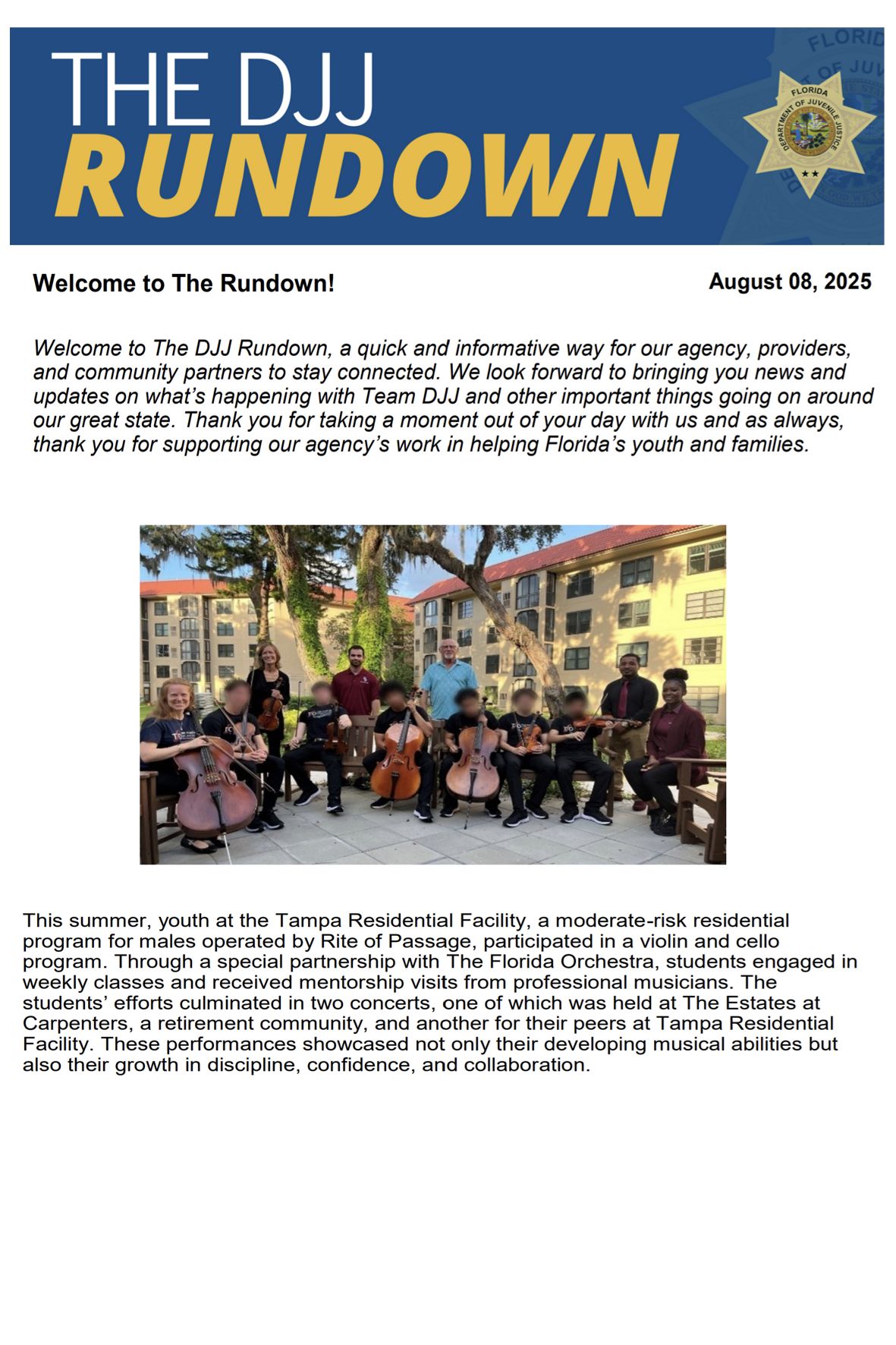 The DJJ Rundown, Florida's Dept of Juvenile Justice newsletter, highlighted the partnership between The Florida Orchestra and Tampa Residential Facility.